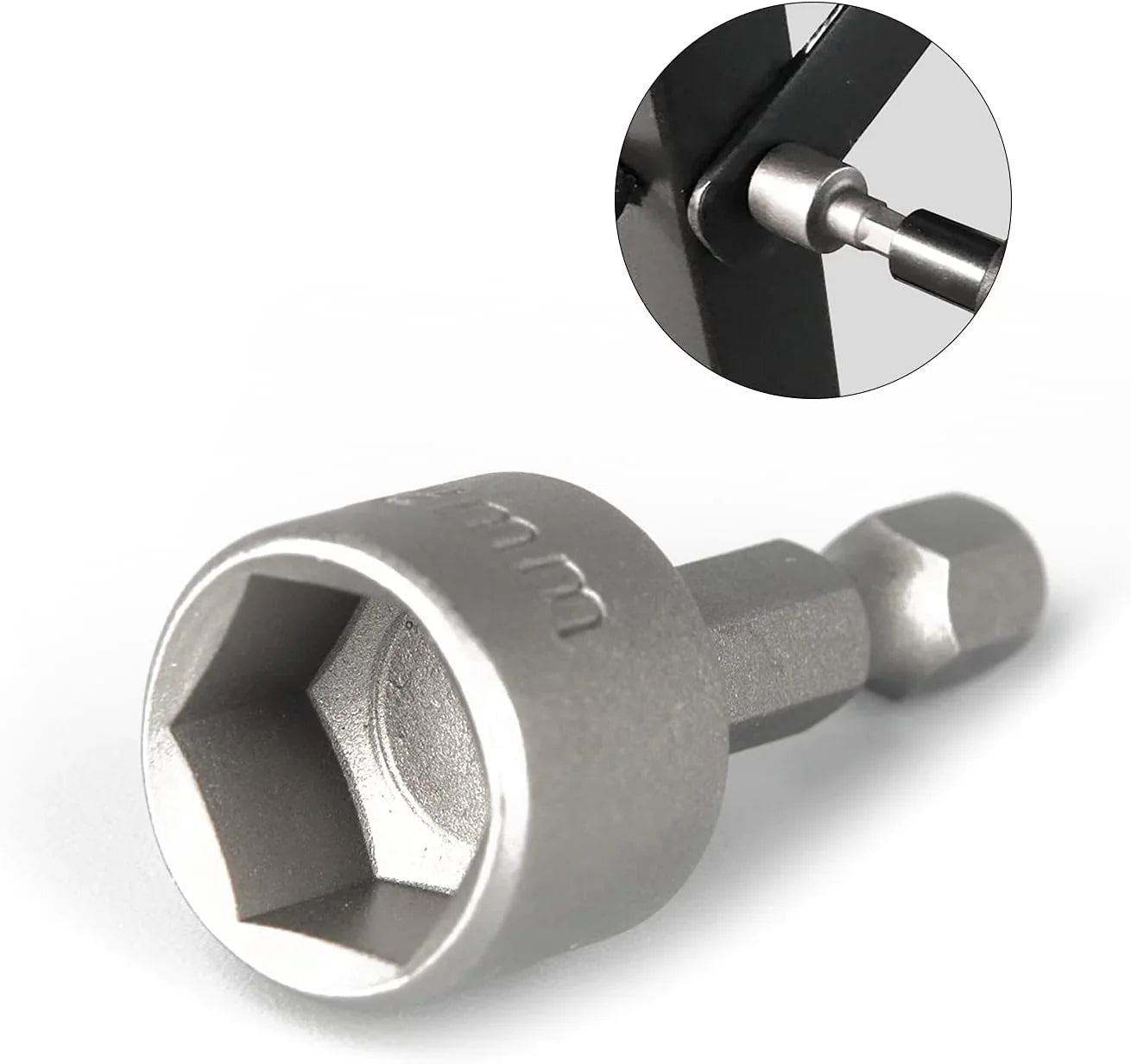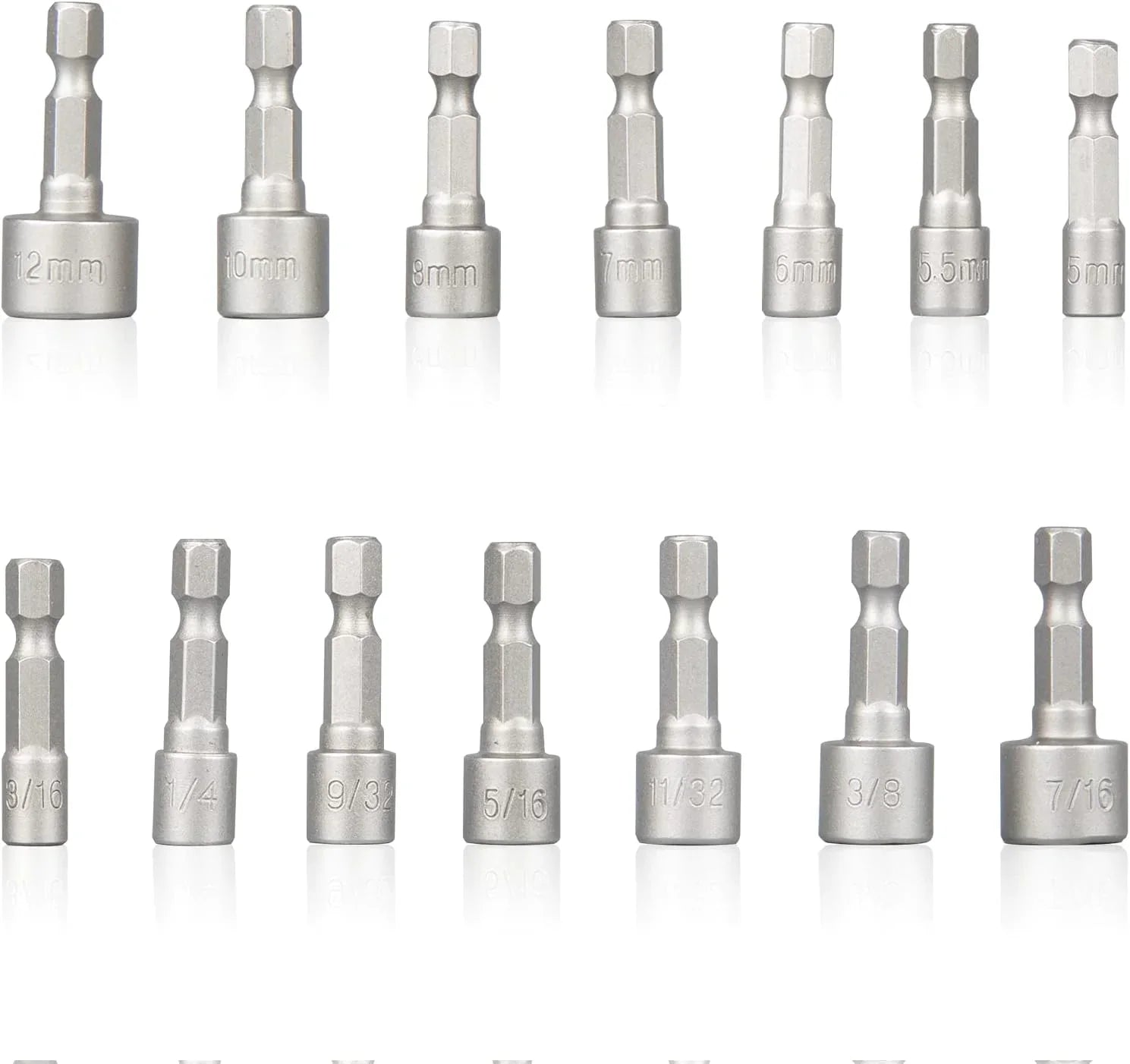 - What You Get: 14-Piece Quick Change Hex Nut Tool Kit with Indents contains 3/16”, 1/4”, 9/32”, 5/16”, 11/32”, 3/8”, and 7/16” Standard Sizes as well as Metric Sizes in 5mm, 5.5mm, 6mm, 7mm, 8mm, 10mm, and 12mm, as well as a handy tool bit holder to keep your kit organized and ready to use.