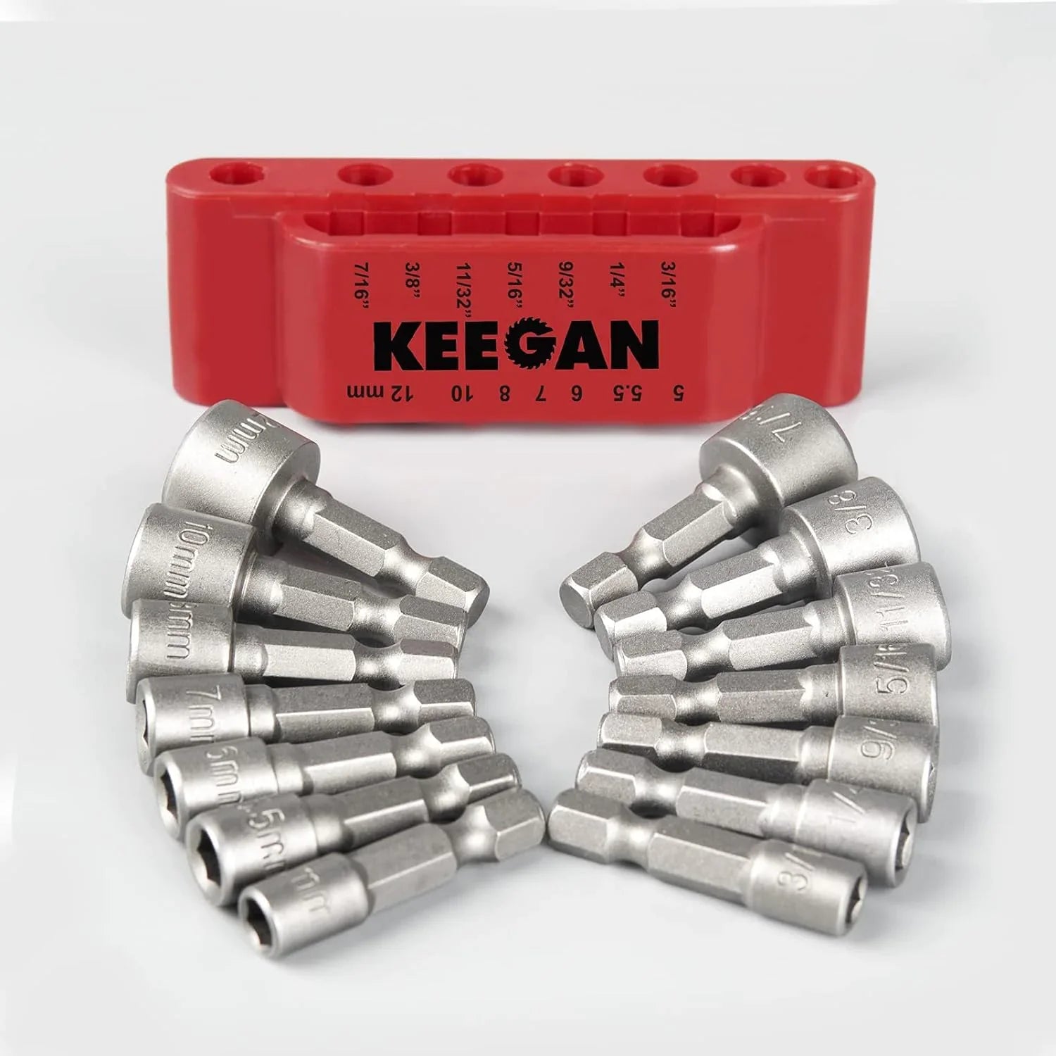 - KEEGAN TOOLS 14-Piece Quick Change Power Nut Driver Bit Set with Indents, 1/4” Hex Shanks Fit Quick-Change/Release Chucks and Lock Firmly in Standard Chucks, Includes Easy Holder Storage.