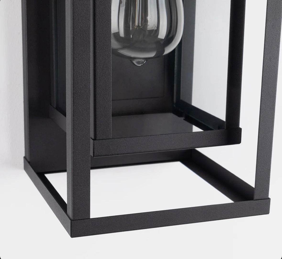 - A matte black finish and clear glass panels maximize the vintage character of this wall sconce.