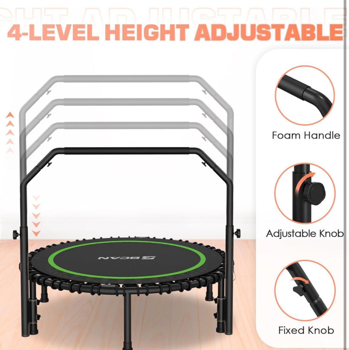 【4-level Adjustable Handle】The fitness trampoline equipment with a 4-level height adjustable handlebar raged from 2'6" to 3'5" (on the mat). Jump with confidence!