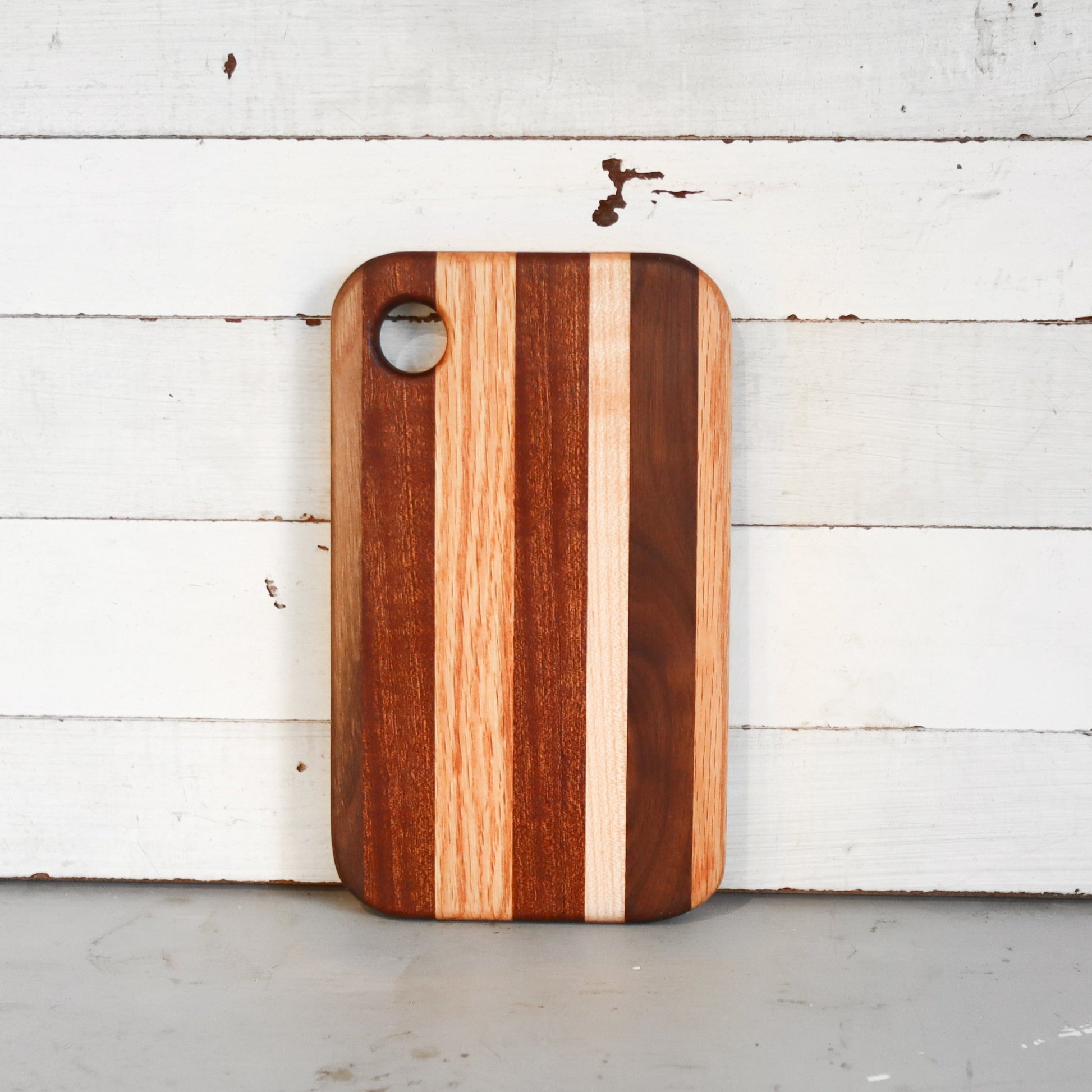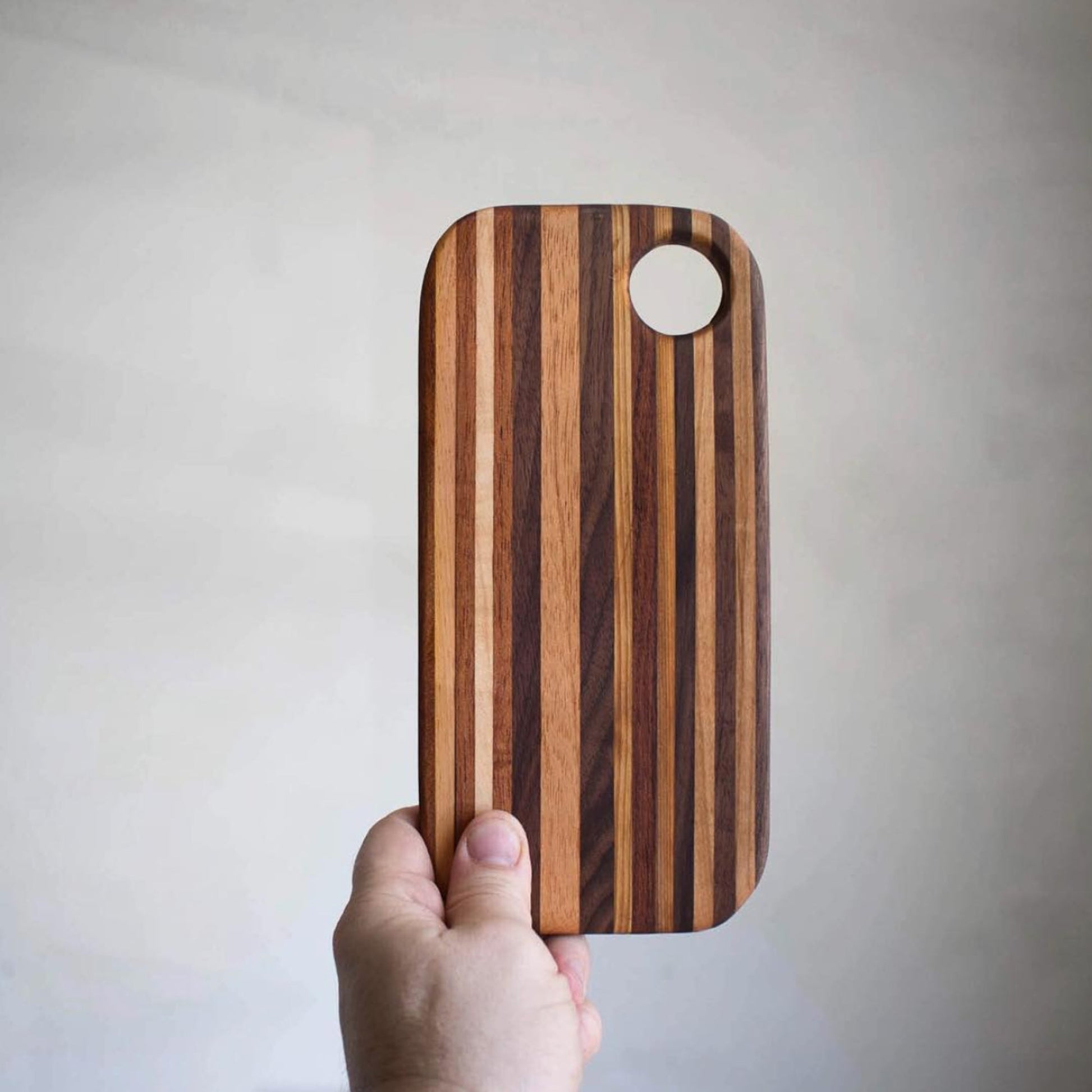 These gorgeous little serving boards are handmade from laminated strips of remnant and reclaimed hardwood for lasting durability and ageless beauty.