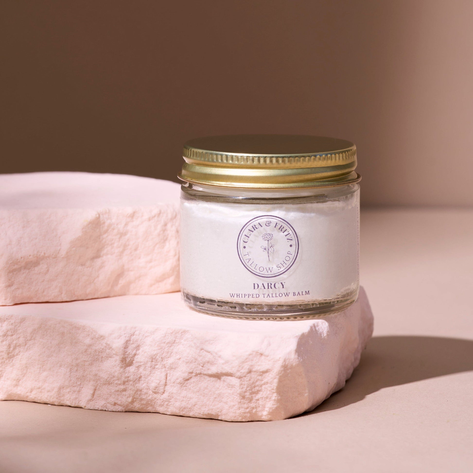 Lightly scented with frankincense, cedarwood, lavender, and helichrysum, Darcy Whipped Tallow Balm is warm, spicy, and grounding. You can use this whipped tallow balm on your face and body.