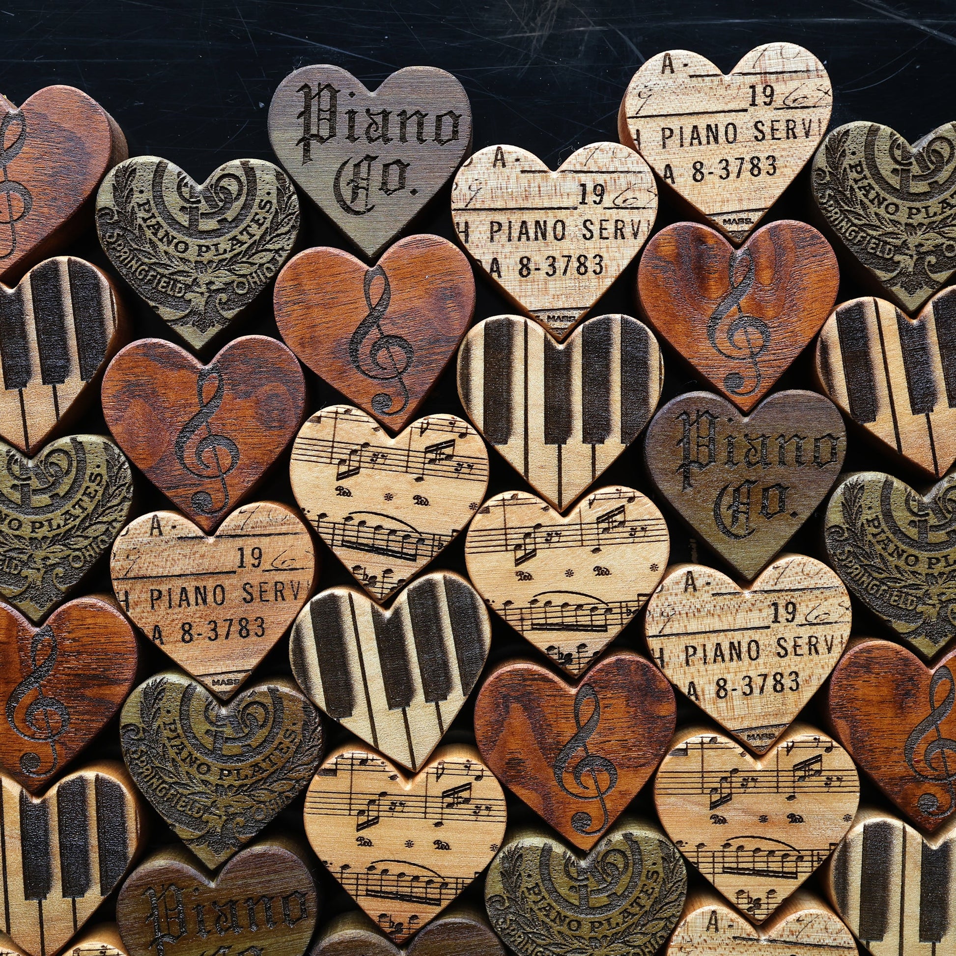 These piano-themed engraved hearts make great shelf decor, can be displayed on your desktop, or can be used to create jewelry, ornaments, or keychains.