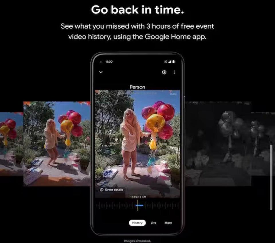 Go back in time - See what you missed with three hours of free event video history, using the Google Home app; The Nest Doorbell (battery) does not record 24/7 video history, even with the optional wired installation; Learn more about the differences between event video history and 24/7 video history at g.co/nest/video history