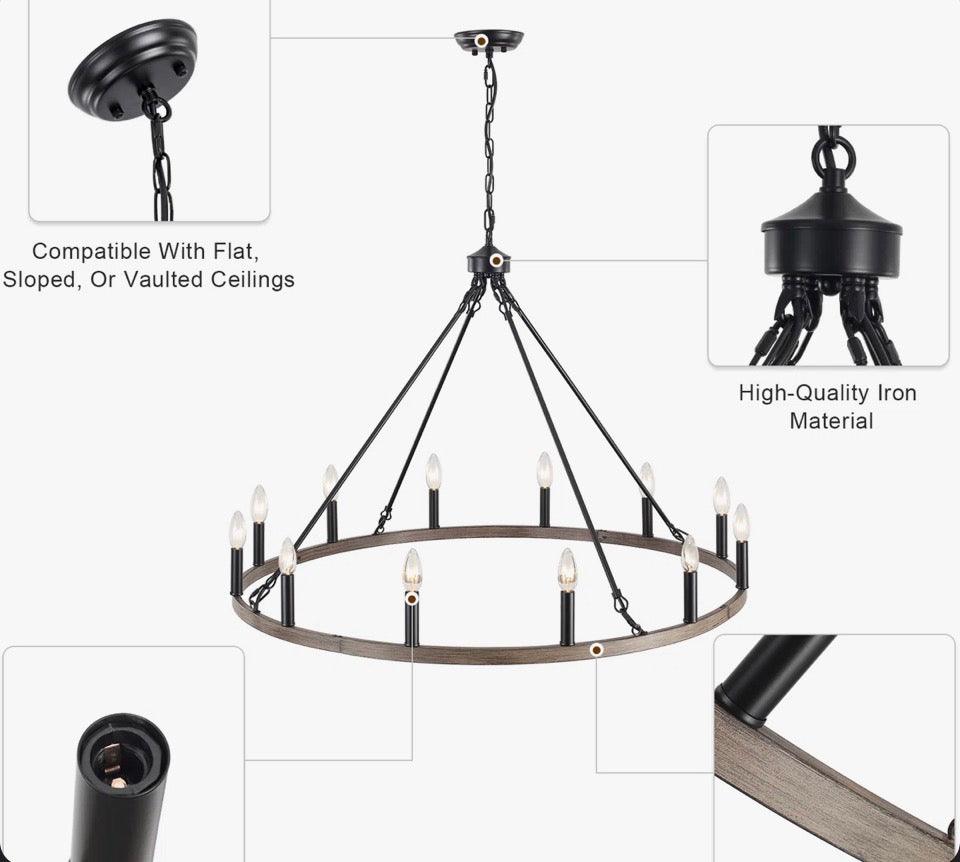 This farmhouse wagon wheel chandelier is made of quality metal and designed with a round frame in imitative wood grain finish and 12/16 blub sockets in a matte black finish, combining modern and vintage, farmhouse and industrial style, very suitable as living room chandeliers, chandeliers for dining room, foyer chandelier, chandelier for entryway and so on.