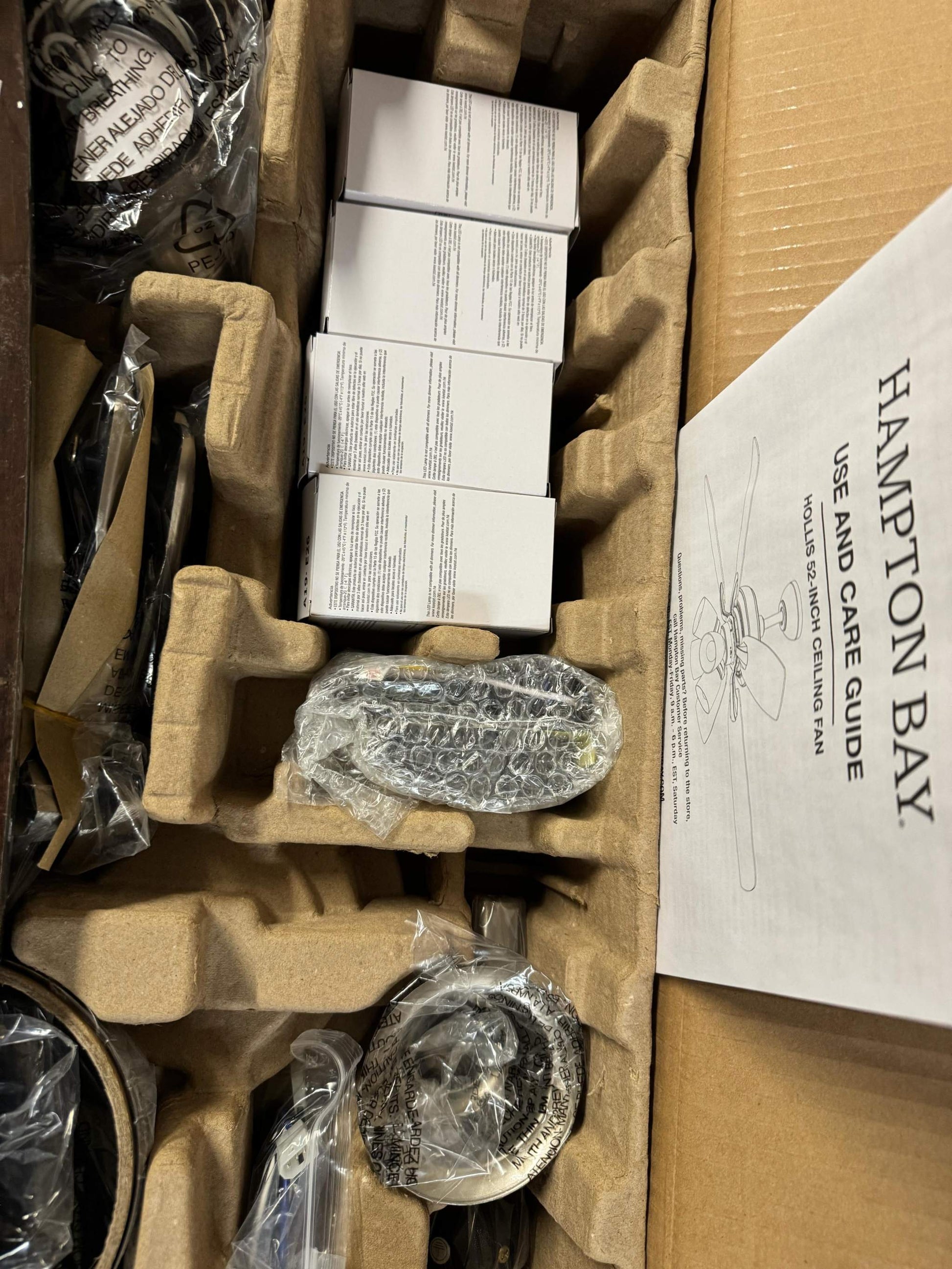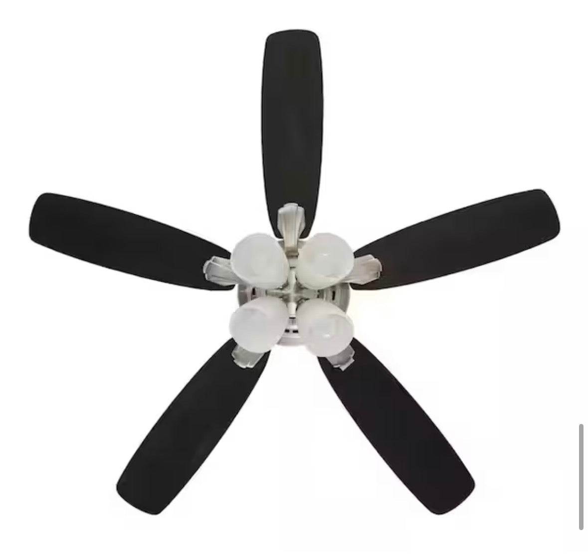 Transitional styling and exceptional performance combine to produce the 52-in. Hollis ceiling fan from Hampton Bay. This indoor ceiling fan is designed to enhance your indoor large room living spaces. The beautiful brushed nickel housing is complemented with 5 reversible blades in mid-century walnut and espresso stained oak finishes. The 4-light dimmable light kit produces ample illumination using four 9.5-Watt LED bulbs (included). Installation is a breeze thanks to QuickFit technology features like a slide-on mounting bracket, AccuArm blade brackets, twist and lock shades and Quick Install blades. Control is at your fingertips with the included handheld remote to operate the fan's 3 speeds and light (on/off/dimming). A wall cradle is included to store the remote when not in use.