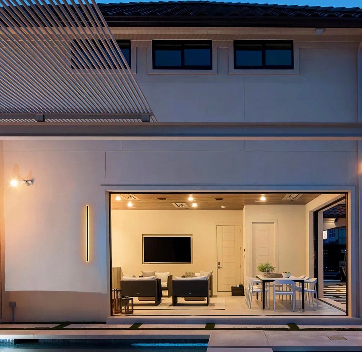 Imagine a bar of light, gracefully slanting to paint your outdoor area with a warm, welcoming glow. The Slender Sideway Outdoor Wall Sconce epitomizes sophistication, designed to captivate your senses and redefine your outdoor ambiance. Please note: This linear LED wall light is 3.5 inches wide. Be aware that this width may not fully cover your home's electrical box.