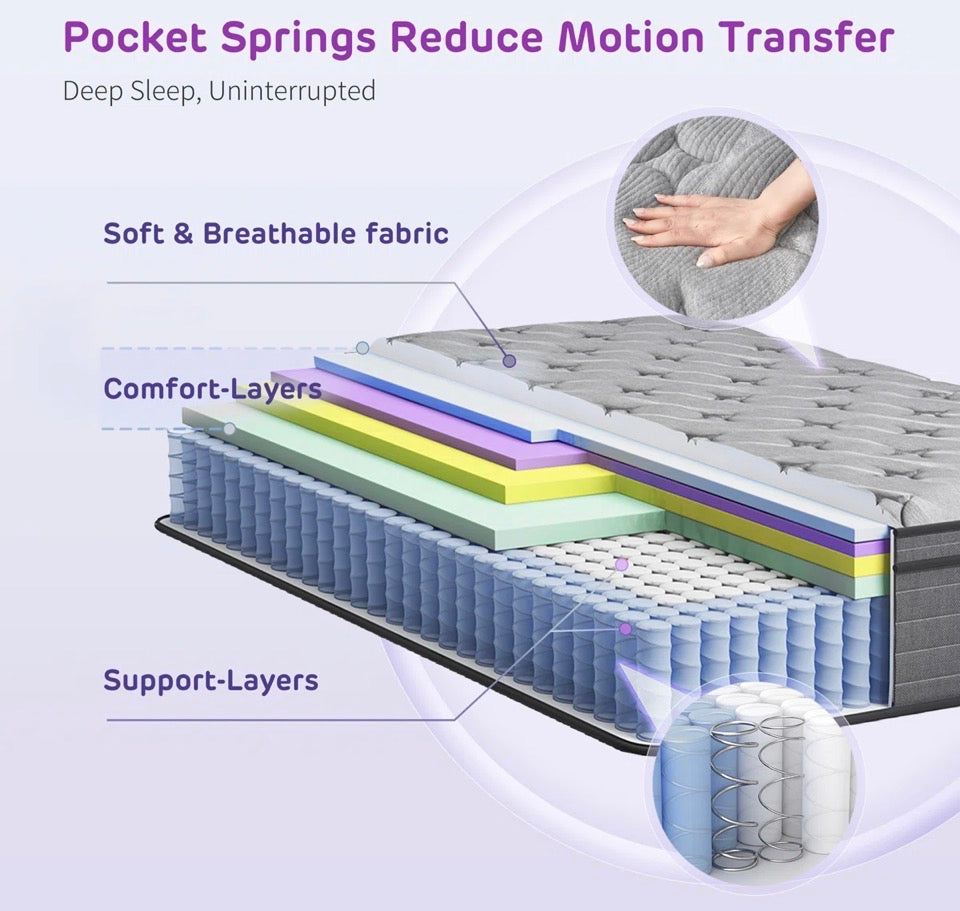 Individual Pocket Coils: The layer of individually pocket coils provide durability. The coils also enhance airflow and prevent sagging and motion transfer. This firm mattress offers a balanced feel that combines the contouring of memory foam and the responsiveness of innerspring coils. You can enjoy the pressure relief and motion isolation of memory foam, as well as the support and edge stability of innerspring coils.
