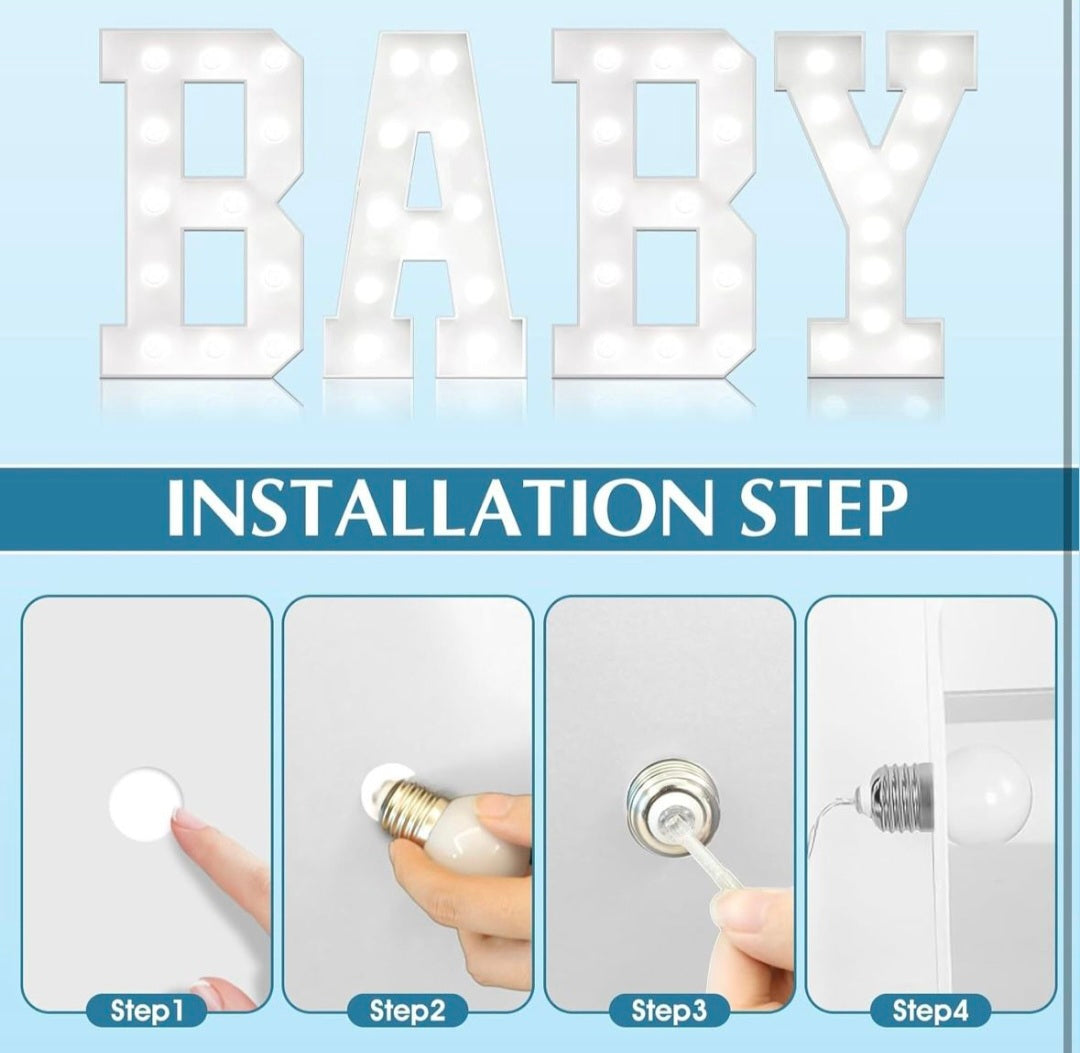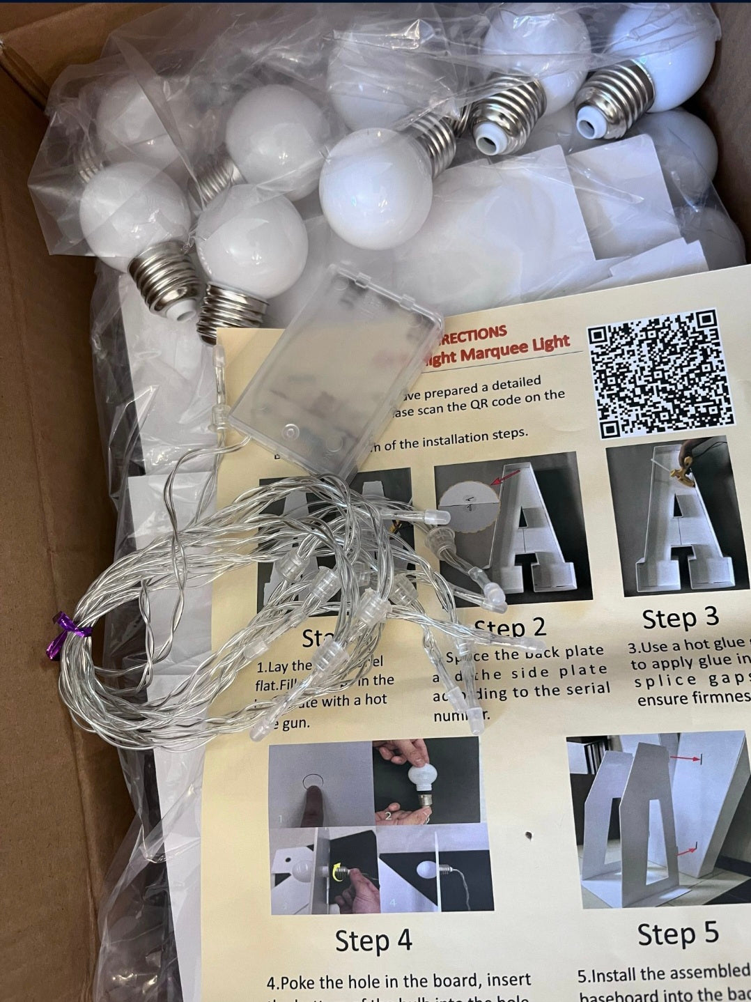 * 【Assembly Required】Each marquee light up letter is made of precisely pre-cut foam board, comes with the same model of light string and LED bulb, and a user-friendly instruction manual. According to our installation manual, ① Fold the side panels along the cutting line and stick them to the bottom panel with hot melt glue according to the corresponding number. ② Screw the bulb onto the single board, and then install the LED light string into the bulb. (Note: Glue gun and battery not included)