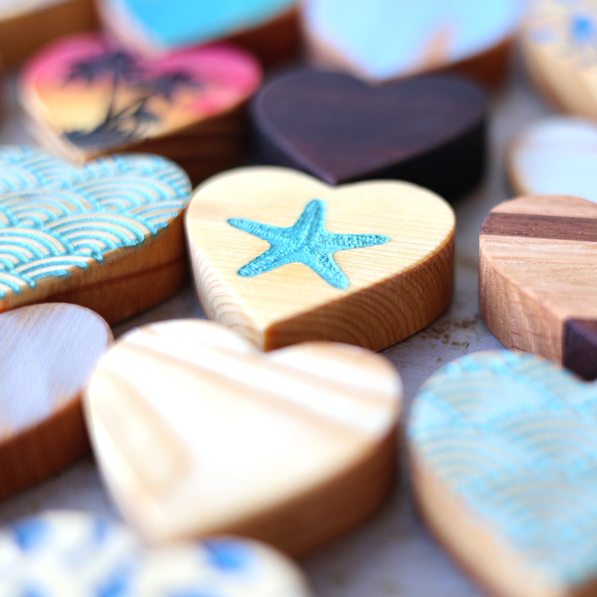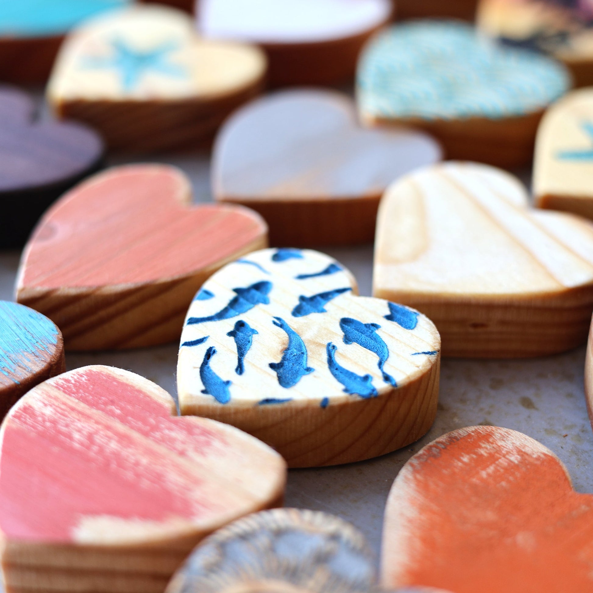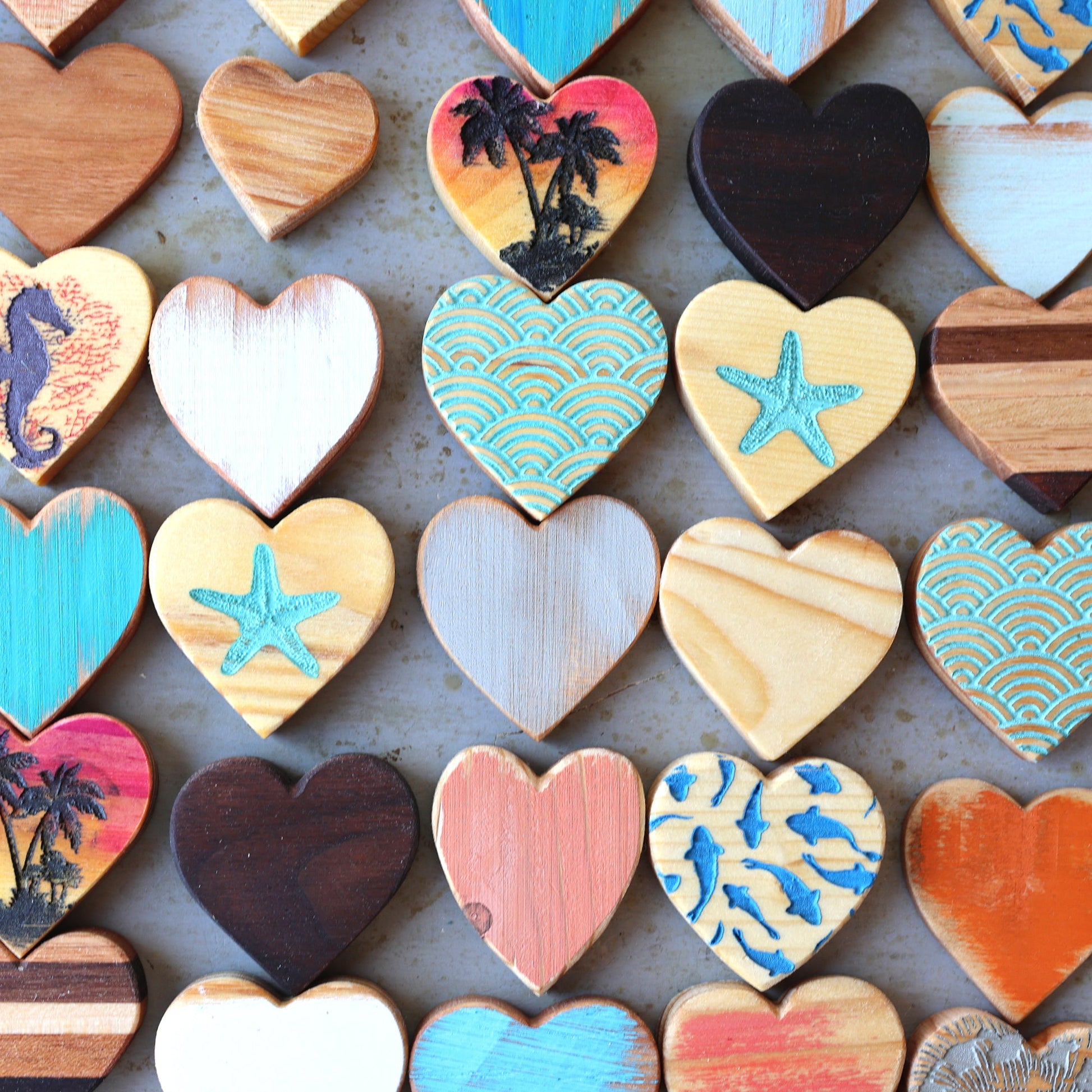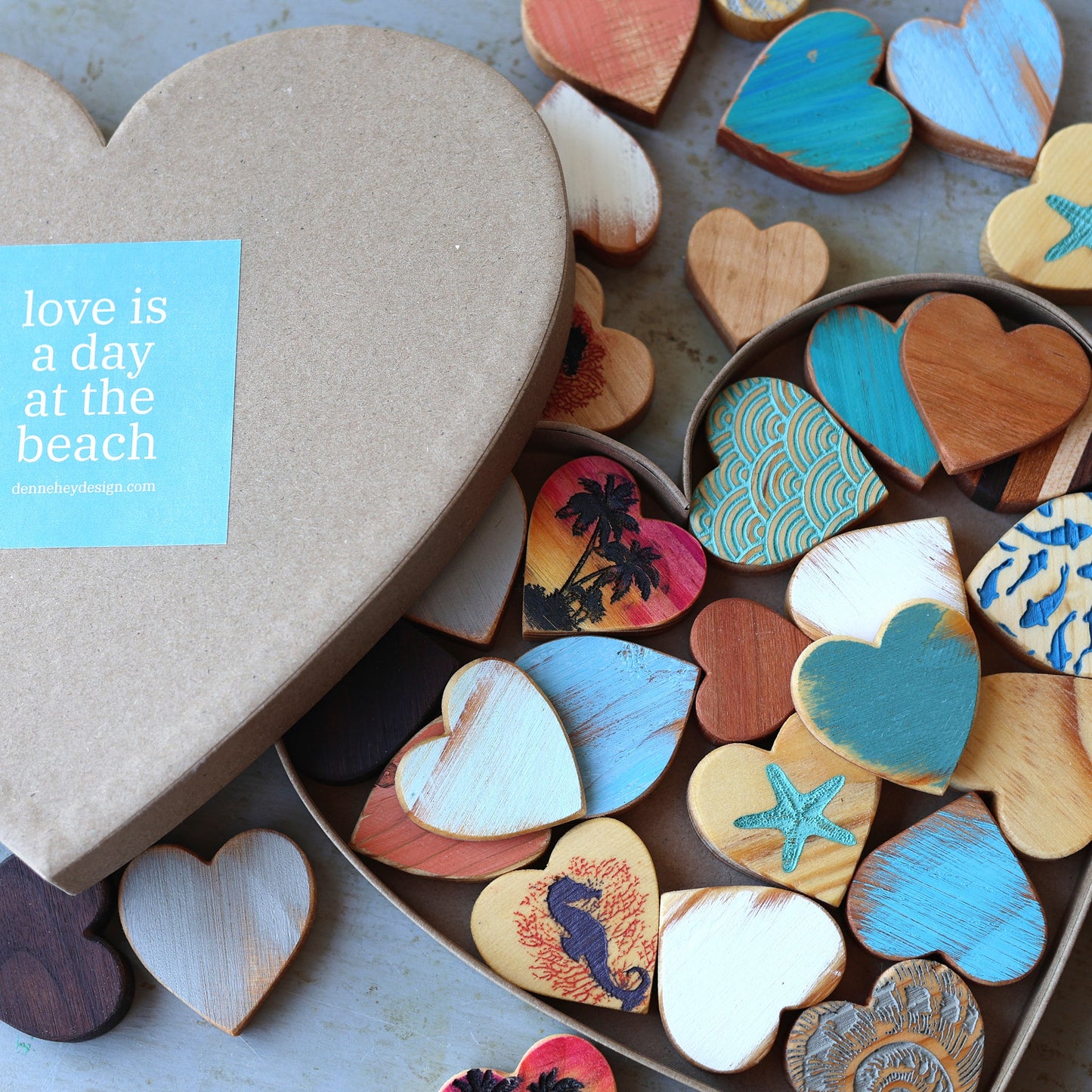 We filled heart-shaped boxes with an adorable assortment of wooden hearts with beach-inspired designs and coastal colors. Every single box is filled to capacity with a super cute variety of hearts that our team lovingly curated and packaged just for you 💙