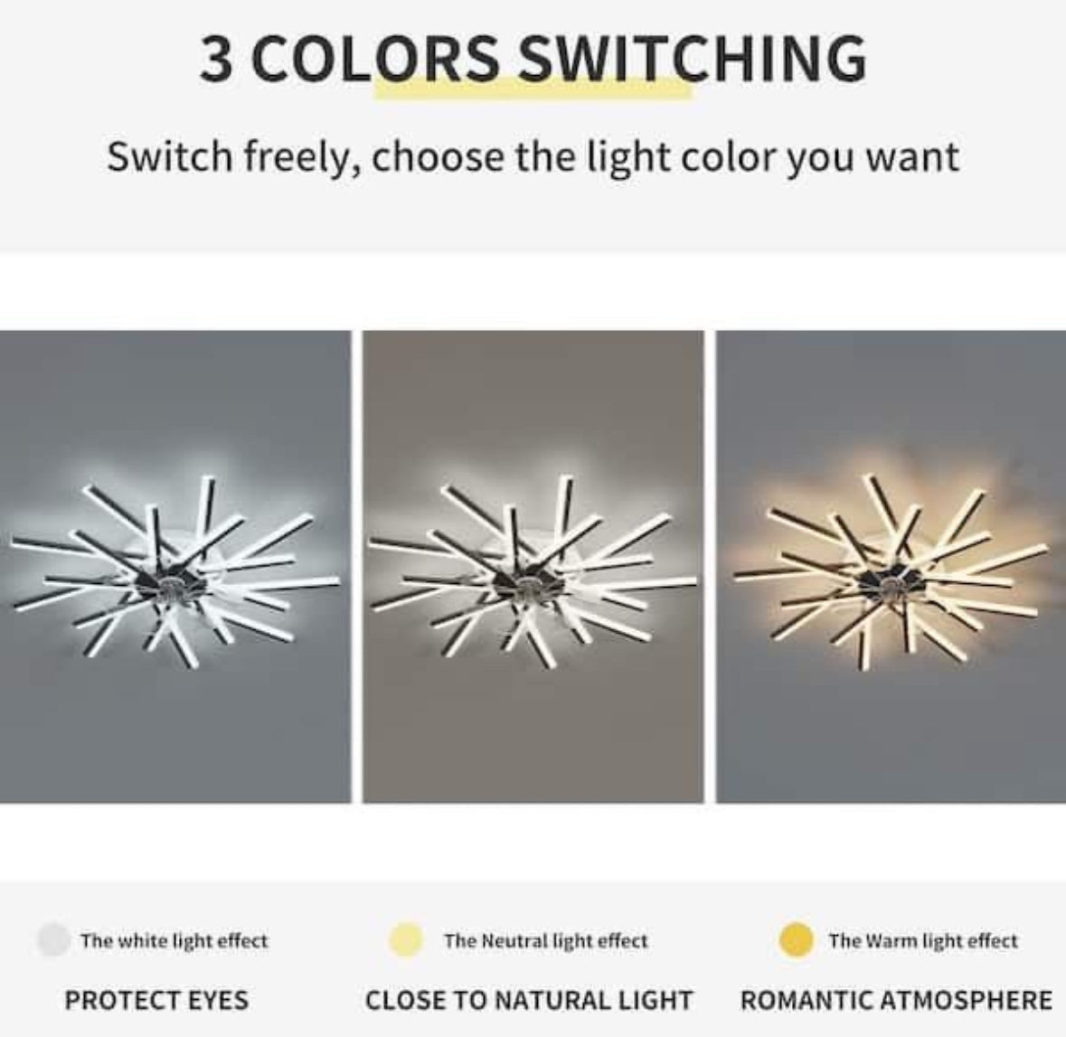 Ceiling fan lights can be switched between white light 6000K, neutral light 4500K and warm light 3000K through the remote control