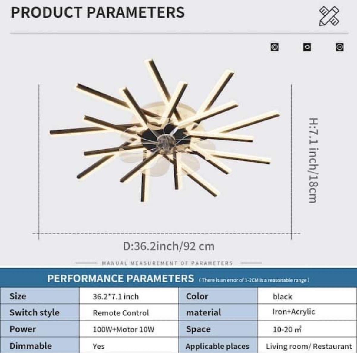 Can illuminate a specific area, while cooling and improving air circulation. It is made of high-quality materials, meeting your daily needs and serving your modern home for a long-time. The matching design of the fan brings you cool natural wind in the hot Summer. The remote control switch allows you to control freely on the sofa or bed.