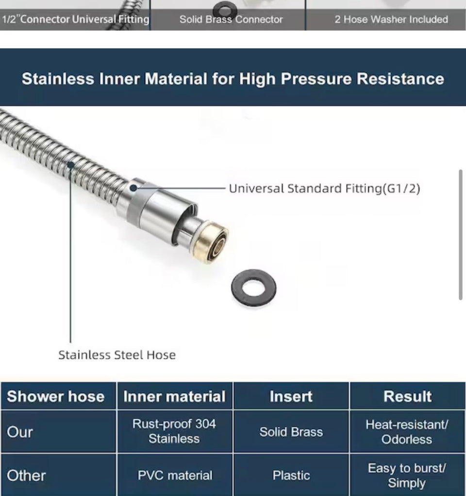 The shower hose connectors are 1/2 in. US standard threads size and fit most shower fixture. Just simply screw onto any global 1/2 in. interface. Solid double brass connectors will never get rusted, included 2 pre-assembled silicone washers to prevent water leakage. 59 in. long flexible shower hose for your kids and pets, allowing you to reach places with handheld shower that you couldn't reach before.