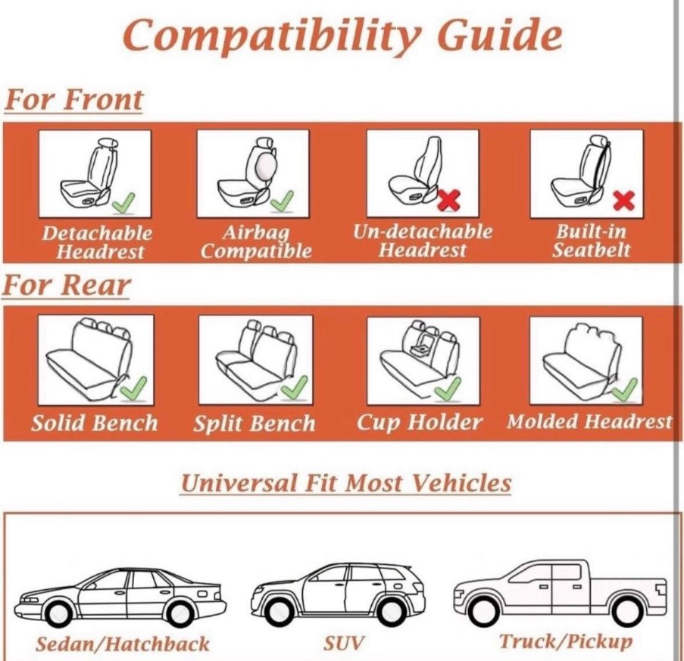 【Universal Fit】: Each pack comes with 2 front seat covers with head pillow and 3 rear seat covers, which are compatible with most Cars, SUV, Truck and Pick-up. You can easily install a custom new look on your seats without any hassles