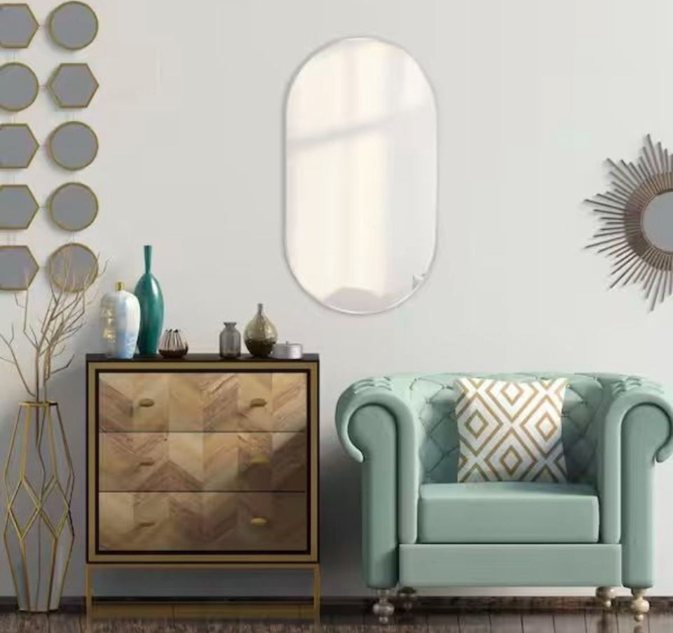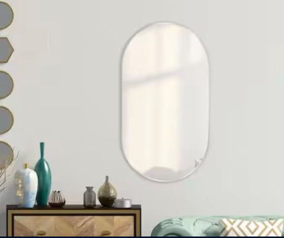 Outer dimension is 18 in. x 30 in. x 1.08 in. Designed with Aluminum frame. It's pill shape mirror. It's silver color.