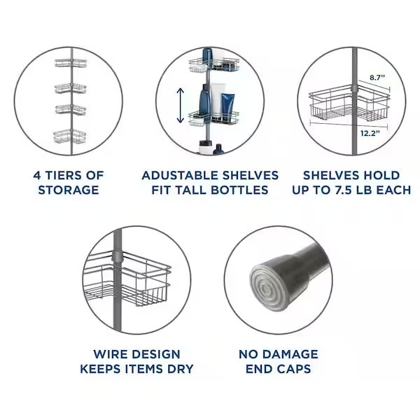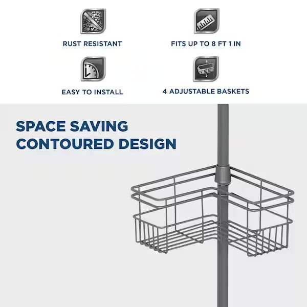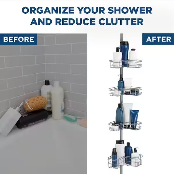 The Glacier Bay "L" Style Tension Corner Pole Caddy in Satin Nickel will help organize any bath or shower. Its four large shelves, including one deep shelf for taller items, can hold shampoo, conditioner and other bath items. The caddy installs quickly and is held firmly in place by a tension bar that extends up to 97 in. Installation is easy and no tools are needed.