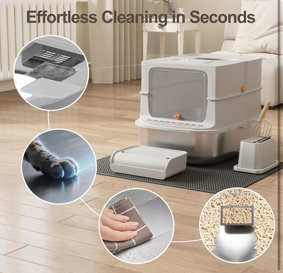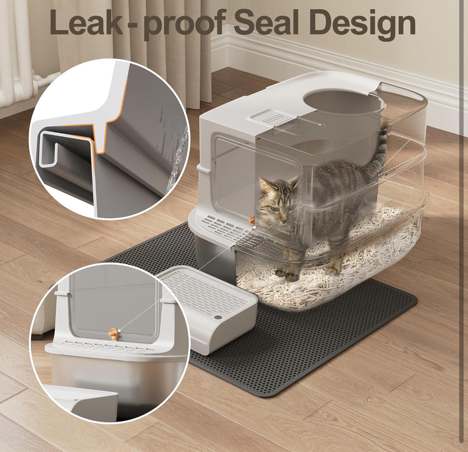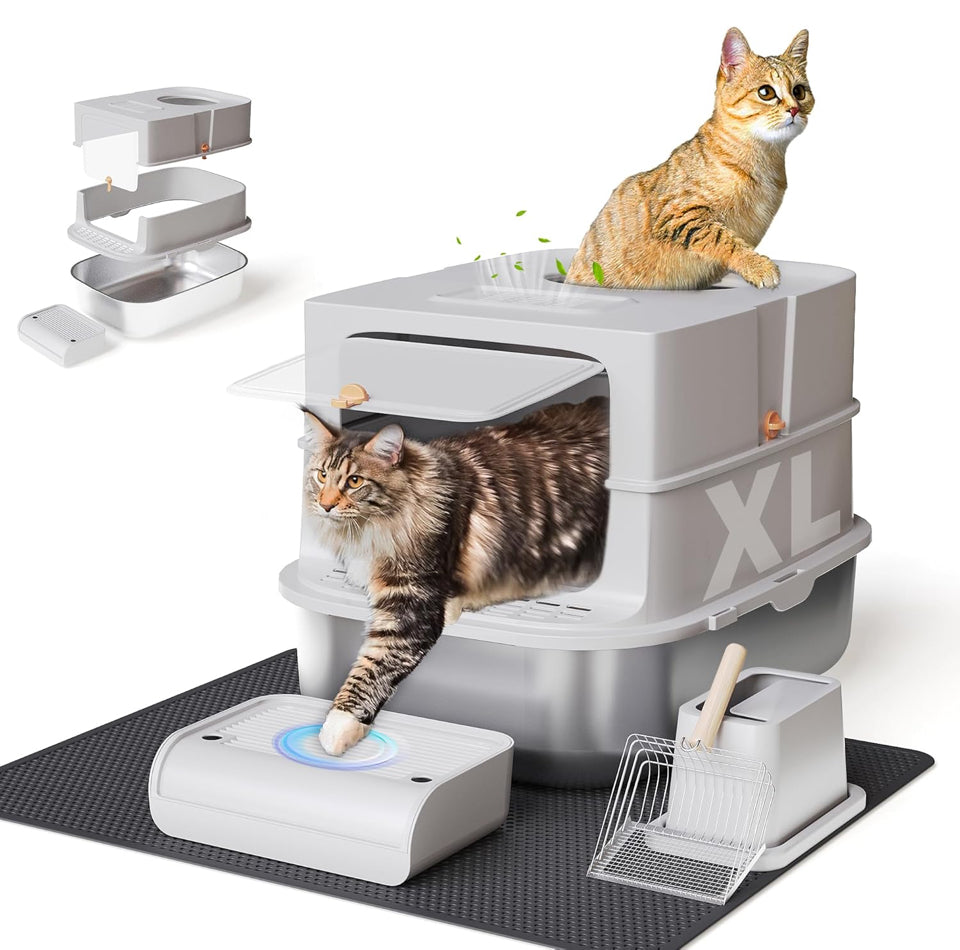 😽💟【Contain Mess & Odors】The xl cat litter box traps smells with a bamboo charcoal filter. Switch between fully covered privacy mode & semi-open setup in seconds – works as stainless steel cat litter box or open tray.