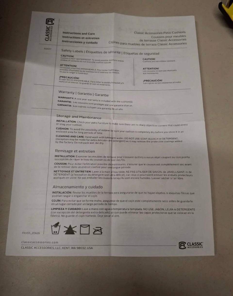 Water-resistant coating and backing resists stains, helps keep out the rain, and protects your cushion foam