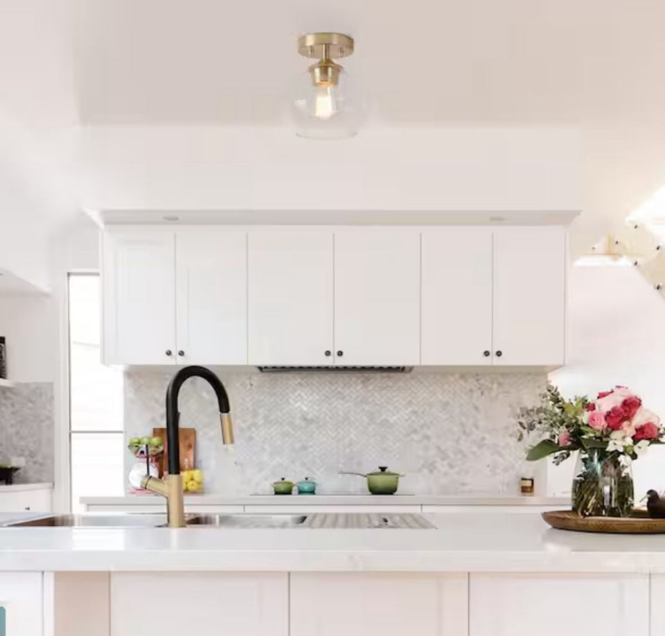 Grandmillenial: the matte brass color and shapely clear glass shade of the Harrow Semi-Flush Mount come together to create a feeling of nostalgia that sits in the pocket of grandmillennial design