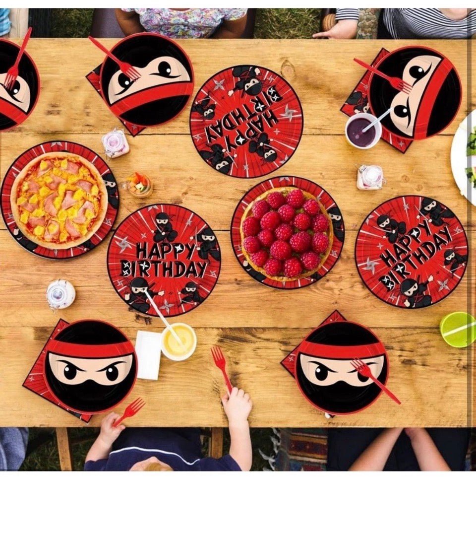 Dynamic Ninja-Themed Design: Elevate your party decor with bold red and black ninja-inspired patterns featuring shuriken stars, masks, and samurai motifs! Designed to thrill young ninja warriors, this set matches the edgy aesthetic of modern kids' parties. The high-contrast colors and action-packed graphics ensure a cohesive theme, making it perfect for birthday photos, table settings, or DIY ninja training camp decorations