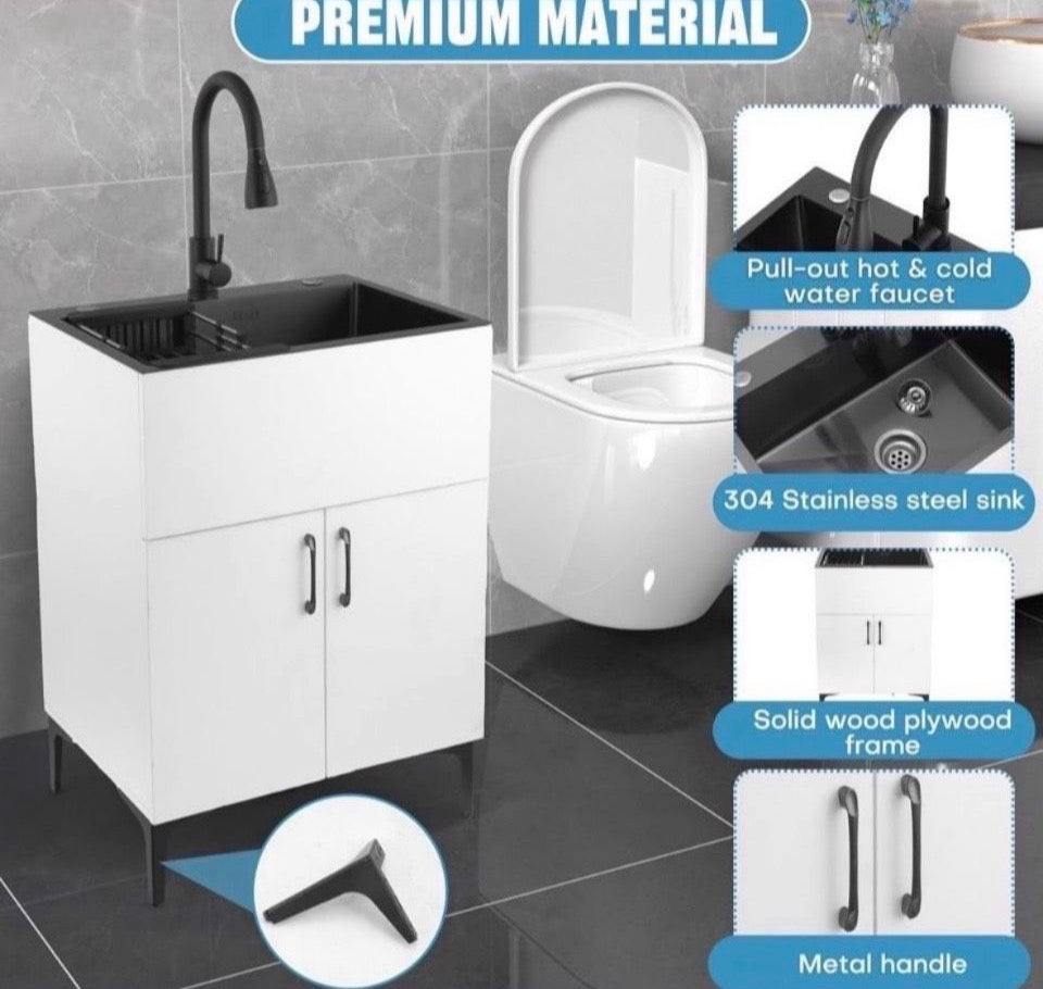Open Box New Ownsig 23.6 inch Stainless Steel Laundry Sink with Cabinet and Pull-Out Faucet, Free Standing Utility Sink with Draining Basket