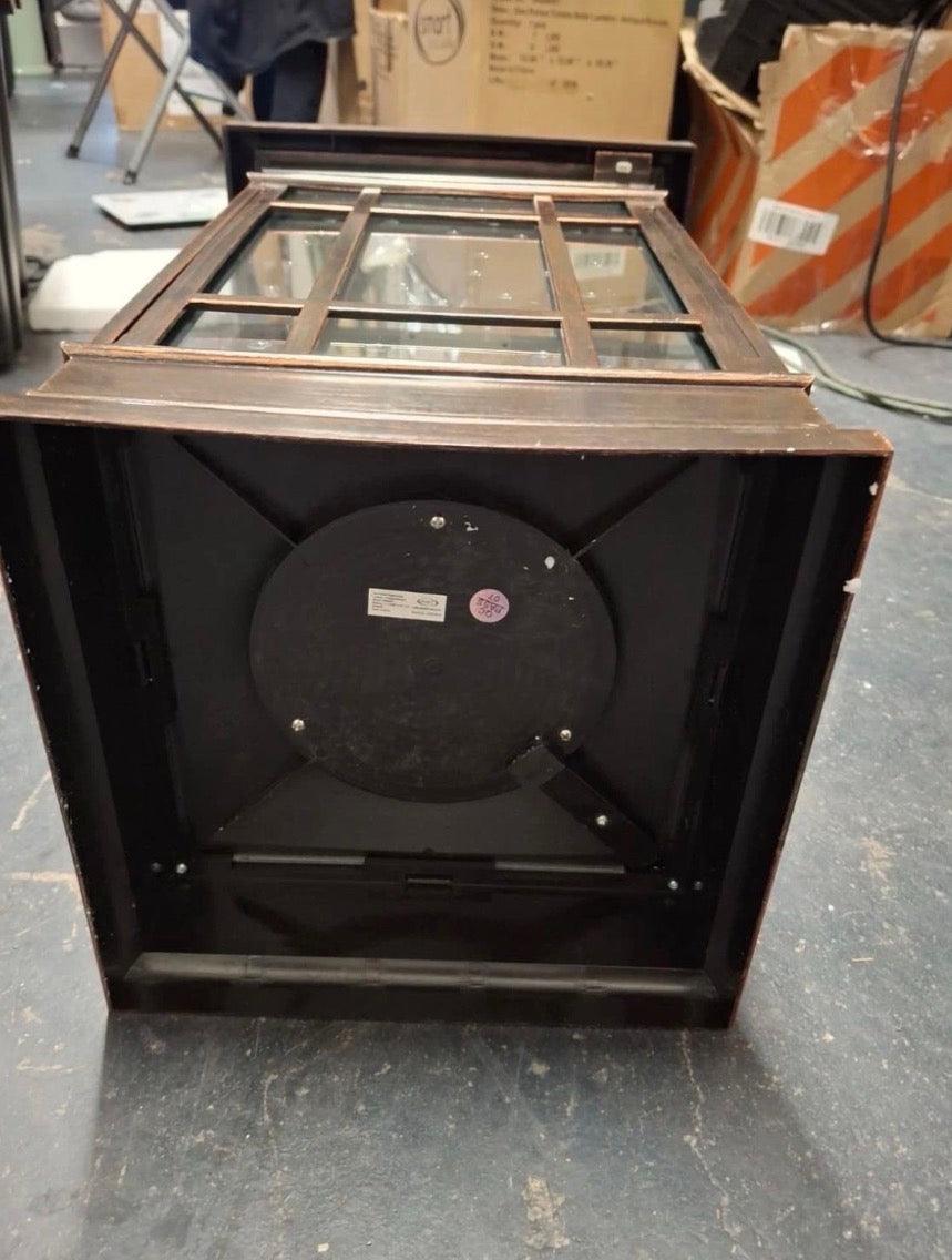 Pillar candle inside lantern contains one amber LED for a warm glowing effect