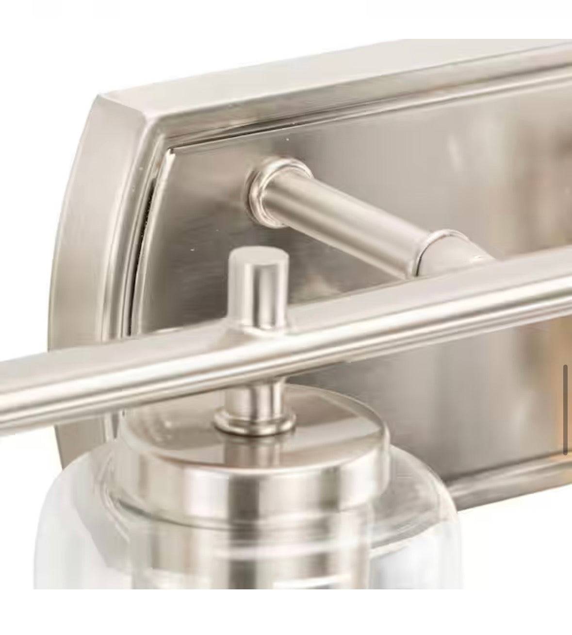 - Backplate has a graceful, beveled detailing and is attached to a simple bar holding the clear glass-shaded lights