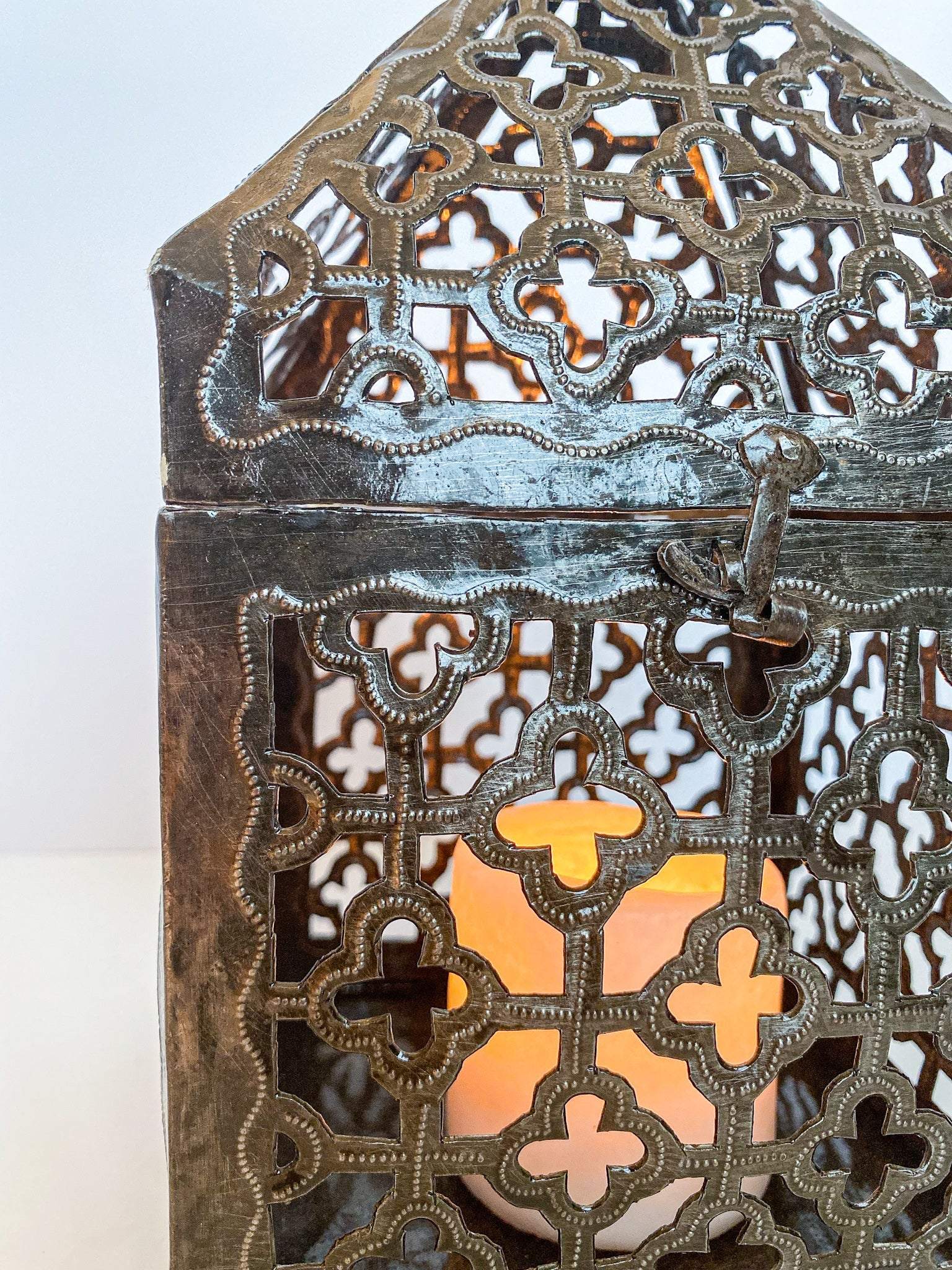 Intricate metal lantern, handmade with recycled steel. Open it up and place a light or a candle inside to enjoy the full effect of its beauty! A true piece of art.