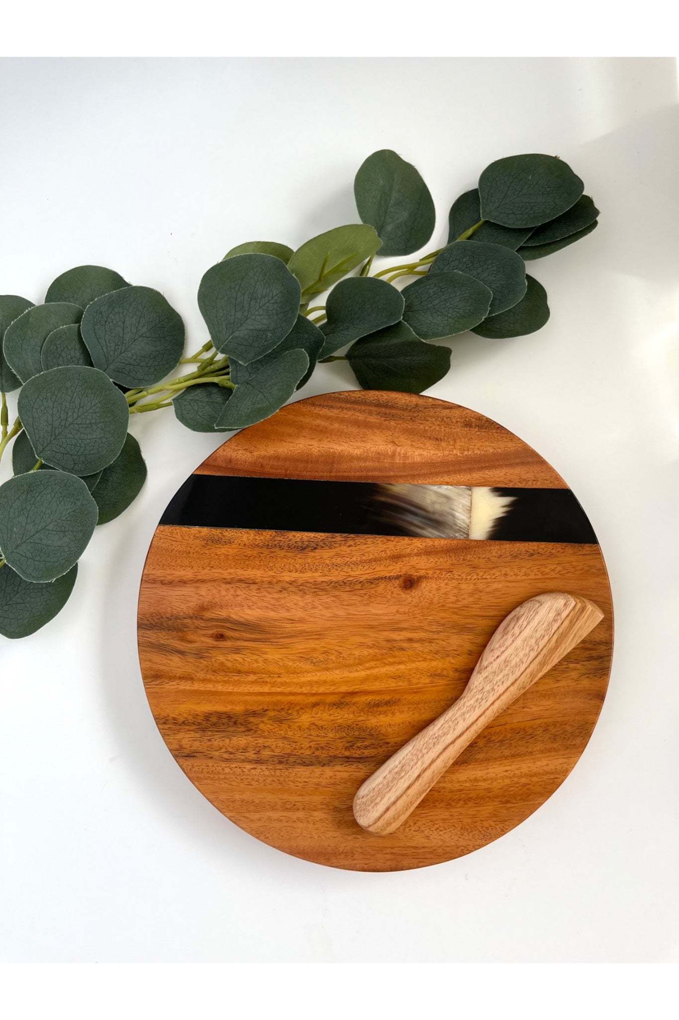 Round Cheese Board set with 1 hand-carved wood knife. This is a perfect hostess gift! An absolutely breathtaking solid wood cutting board with a mosaic horn inlay.