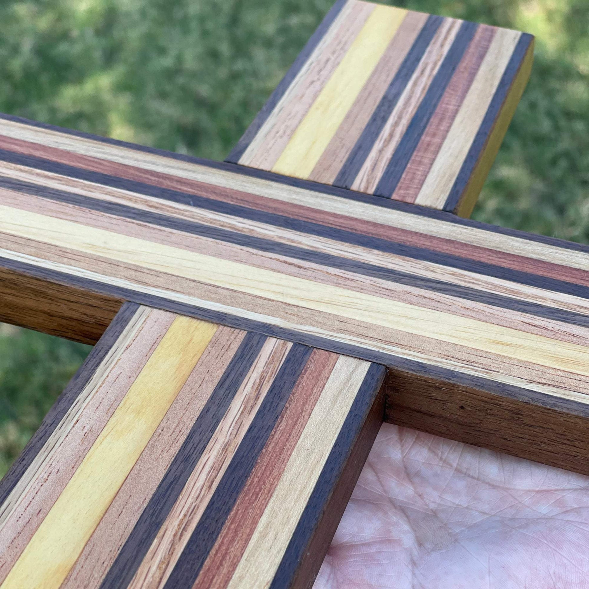 These wall-hanging crosses are handcrafted with various remnant woods including, but not limited to: Oak, Walnut, Spanish Cedar, Cherry, Cypress, Maple, and