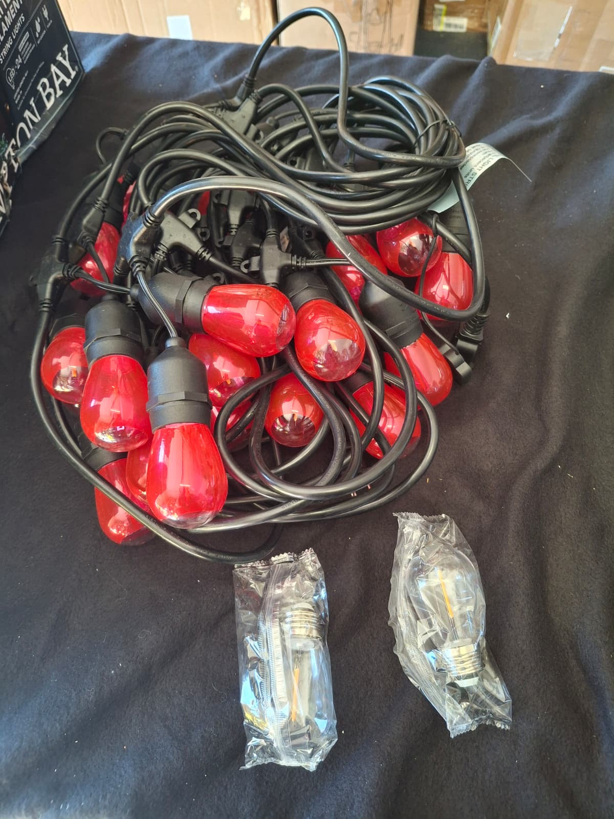 Package includes (1) light string with medium base (E26) socket, (24) S14 medium base (E26) single filament bulbs, (2) spare bulbs