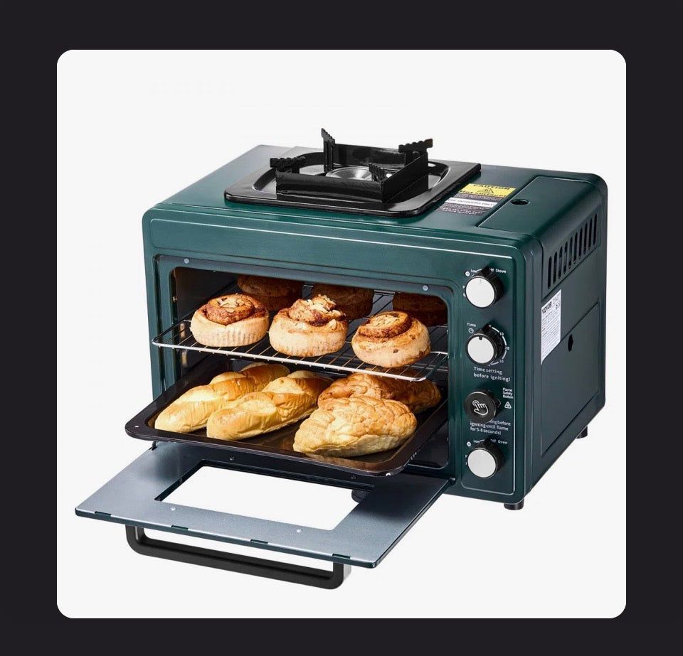 Camping Oven – Versatile cooking made simple for outdoor occasions:This 25L outdoor oven features an oven-stove combo design with adjustable temperature control and a timer, making it ideal for outdoor BBQs and camping. The heatproof handle and ignition security knob ensure secure baking.