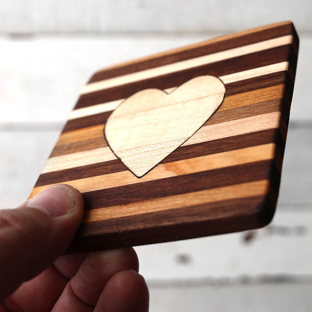 Glued-up remnants collected from our Texas workshop are the main source of wood for these heart embellished coasters—they are beautiful, sustainable, handcrafted gifts!